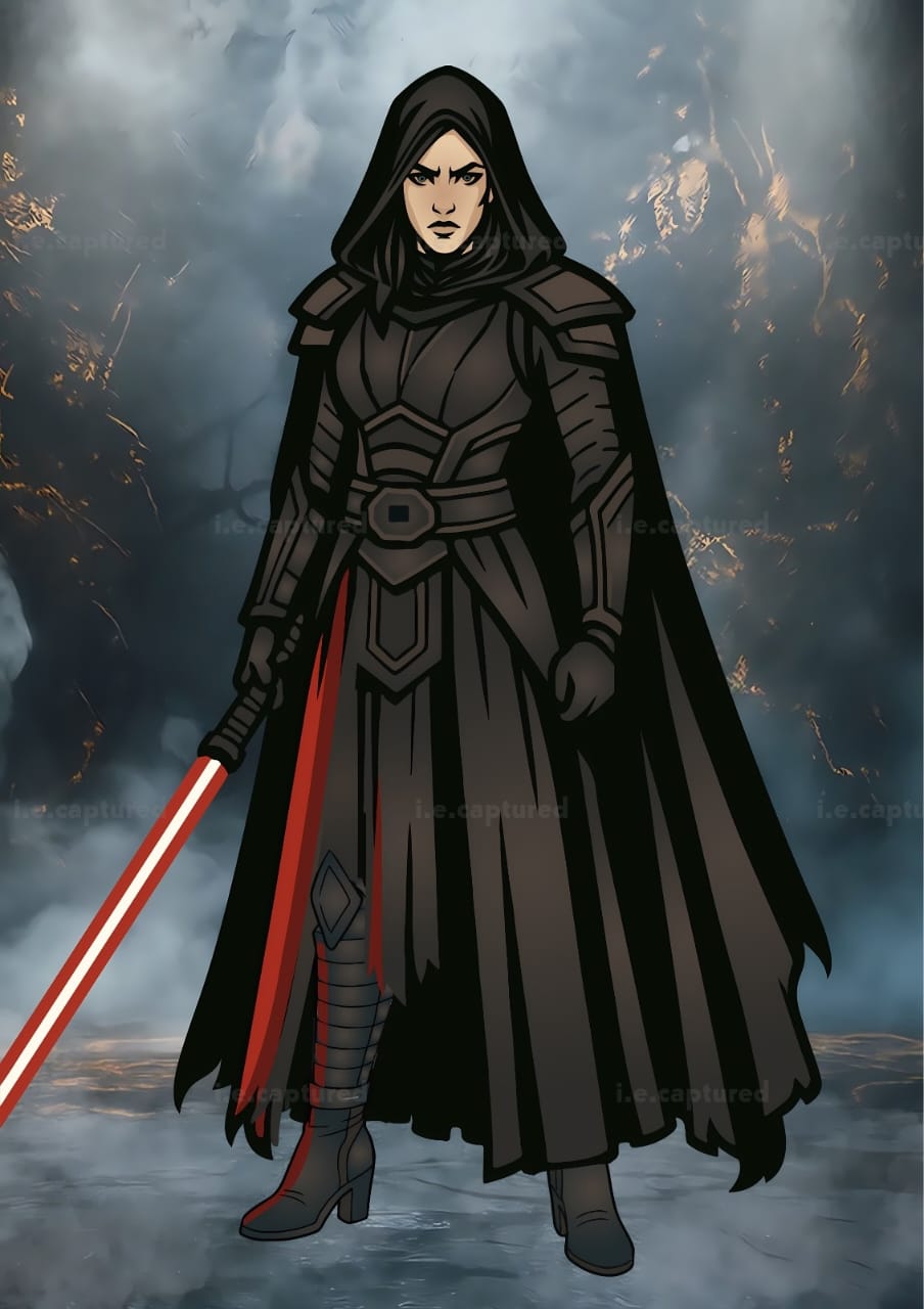 This piece was a custom character commission where I reworked the client’s original character, Valeria Fel, into a darker, more Sith-driven version of herself. The idea was to merge Sith elements inspired by Darth Zannah with her Imperial Knight roots, pushing the design toward a more dominant and intimidating presence without losing her identity. We refined the look step by step, starting from a full-body sketch, adjusting details like armor structure and boots based on reference feedback and then moving into the final coloring. I kept the palette dark and restrained, focused on strong shapes, clean linework and a cinematic mood, finishing the piece with a one handed double bladed lightsaber to reinforce her Sith influence. The final result is a balanced mix of aggression, elegance, and character personality.